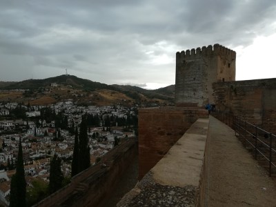 Leaving the Nasrid Palace, once again we had to wear our cagoules due to the rain. We saw a small wooden kiosk that was selling refreshments; it was built around an old stone fountain. We ordered cafe con leche and sheltered for a while beneath its narrow overhanging roof before continuing towards the Alcazaba with our hoods tightly pulled up. After climbing some stone steps at the side of the fortress we had a view of the Albaicin District and the place where we had sat gazing at the Alhambra last night.