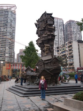 Gerry then took us for a short visit to the Hongya Cave, Folk and Customs area. This is a tourist area with shops and restaurants built into the side of a cliff, which overlook the river. Just as Gerry was telling us it was time to leave Pete spotted the sculpture of the stilted buildings that we had seen while researching the area. The rest of us ran to have a look too, leaving Gerry alone in the lift with a bewildered look on his face.