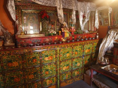 Stairs led up to a large square area that had lots of plants. The transparent plastic roof made it a bright and light place; washing was hung up drying. When we entered the spacious kitchen, a toddler and his grandfather were there, Dawa introduced us to them. The cupboards that lined one of the walls were beautifully hand painted with different scenes. The kitchen’s oven used dung or wood for fuel. A baby was gurgling on one of the long couches that covered the length of the large room. The toddler’s mum arrived and we were shown the family’s chapel, a room that every Tibetan home has.