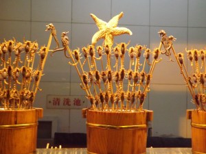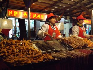 These dishes were next to the more exotic bites, which included scorpions, snakes, ducks, frogs, starfish, shark and octopus all of which were on skewers cooked and ready to eat. I confess that our western tastes did not tempt us to order anything extraordinary. Anne & Pete purchased some dumplings and prawns and Dave and I snacked on some vegetable rolls. Although not adventurous ourselves, we did enjoy watching a group of twenty something’s daring each other to have a bite of the small cooked snake they had chosen.