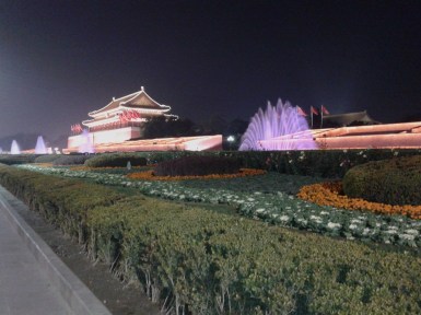 We wandered through the many lanes of stalls all the while heading (hopefully) in the direction of Tiananamen Square. We managed to find it, and the gate to the Forbidden City and the fountains were lit up so we stopped to take some photographs.