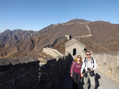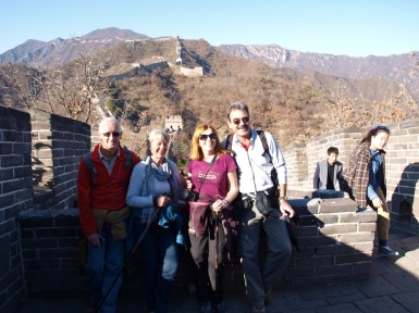 The four of us take the cable car to reach the wall. Wow the sight before us is unbelievable, the Great Wall of China snakes as far as the eye can see to the east and to the west above stunning mountain scenery. It is a perfect day too, the sky is blue and it is dry. For November we are very lucky!