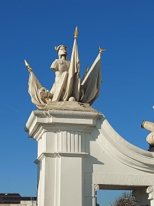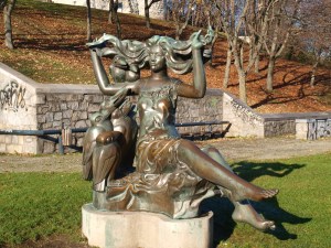 Another interesting statue portrays a woman with long flowing locks, seated next to some ravens.