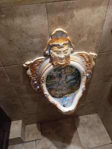 When I was doing research, I came across a recommendation advising that the downstairs of the building where the restrooms are situated was not to be missed. So, off I went down stairs to have a peak! The stairwell had an interesting stained glass window.
