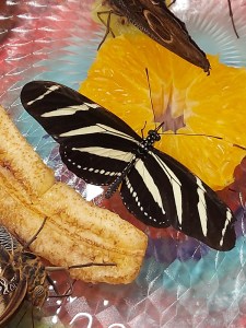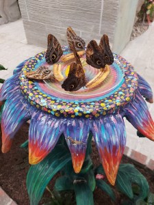 Large colourful painted imitations of ‘Wonderlands’ flowers are used to place food on, many butterflies settle on the flowers. The butterflies prefer fruit that is over ripe.
