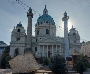 Today, we went to Vienna by train, once there we took the underground to Karlsplatz (Charles Square). A huge church dominates the square. Many workmen were in the square setting up a Christmas market.