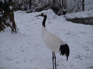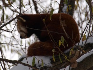 However, two creatures that prefer the colder climate are the red crowned cranes and the red panda. A few red crowned cranes were in a wooded area with a pond, a couple of them were walking across the frozen pond. Close by a cute red panda which was sat on a branch of a tree posed for a photograph.