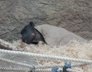 Unable to resist having one more look in the chimpanzee house, we saw one of the young ones asleep on a bed of straw.