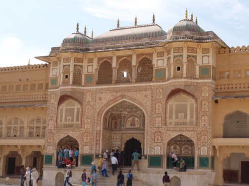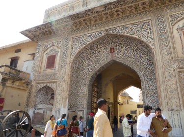 As we entered Amer Fort, also referred to as Amber Fort or Amber Palace, we saw beautifully decorated elephants dropping some tourists off. The Fort is a complex of buildings including elaborate palaces situated around large courtyards. Specifically, we wished to see the Ganesh Gate and the Hall of Mirrors.