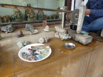 He asked if we were interested in souvenirs and if we would like to go to a handicraft place and see block printing or to a semi precious stones workshop to see how they are cut. I immediately opted for the 2nd choice knowing that Dave wouldn’t mind. I also told our guide that we couldn’t guarantee that we would purchase anything.