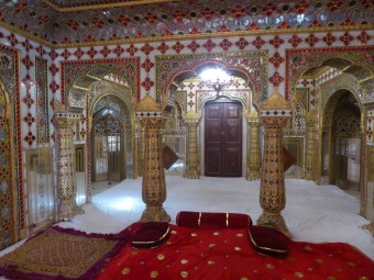 The next hall we visited in this almost private tour of recently unseen parts of the palace was a lavishly decorated room in red and gold. Its Indian name Shobha Niwas translates to Hall of Beauty and it is used on occasion by the royal family for their morning puja (a prayer ritual). The security guard at its doorway instructed us to remove our footwear before we entered.