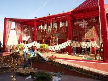 Preparations were taking place within the palace grounds for a huge wedding. Scores of workers were bustling about, a huge stage was being erected, and bolts of red velvet were being expertly attached to its rear wall. Florists were unwrapping thousands of carefully wrapped blooms and arranging them in elaborate and colourful designs. Garlands were also being rapidly and professionally made.