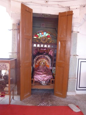 I was spellbound by its interior. White marble bas relief carvings of the gods adorn the walls and only their lips, eyes and tilkas are in vivid colour giving a spectacular effect. The white marble ceiling is intricately carved. A colourful stained glass window portrays the goddess Durga riding a tiger. Different gods are depicted on other windows.