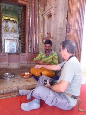 The priest started chanting and whacked me on the head three times with a bunch of peacock feathers. Then he proceeded to wrap a piece of cord around my left wrist. After giving the same blessing to Dave he pointed at the donation tin.