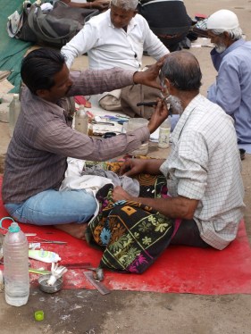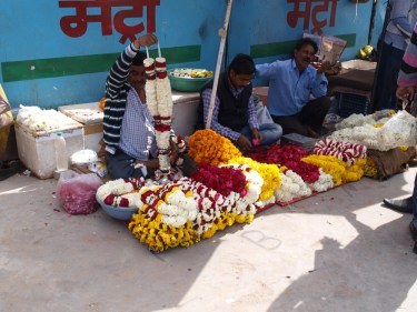 There were a few folk sat here and there on the pavements selling a small variety of fresh produce. Three barbers sat cross legged on one street shaving their customers, their sharp implements laid next to them. We saw quite a few men making colourful flower garlands, the offerings that would be purchased and taken to one of the many temples in the city.