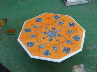 The salesman led us into the next room where the items were displayed. Wow, it was filled with these amazing works of art, marble elephants from very tiny to huge, tables – round, square, oval, octagonal in various sizes. All the items were intricately inlaid with assorted shapes and sizes of gemstones. They are all available with a choice of crystals, carnelian, malachite, agate and lapis lazuli to name a few.