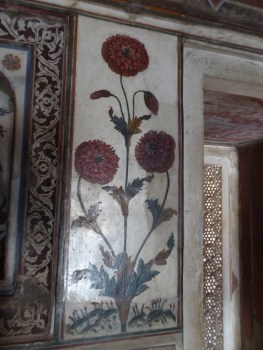 Photography is forbidden within the mausoleum. The two tombs that you can see are actual replicas; the original ones are directly below. A guard shines a torch at some of the gemstones inlaid in the marble, the orange gemstone carnelian is also known as the ‘stone of flame’ and it does indeed shine brightly like a flame when the light is on it. Flowers were created from gems, a jasmine flower signifying the Shah’s wife’s beauty, a poppy representing her delicacy.