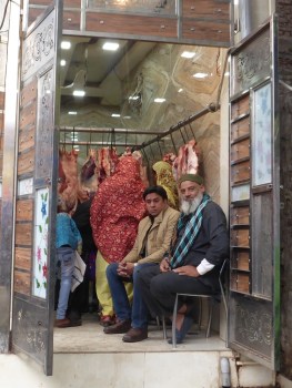 Vibrant coloured scarves were being sold on a stall which stood close to a butcher where huge slabs of meat hung. We stopped and asked for directions.