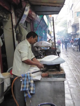 We headed down a different colourful alley, small stalls were offering different foods, and we noticed the chapatti maker, again cooking the bread on the base of the pan. There were also a couple of small cafes.