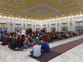 Ram led us to the cloakroom where the three of us removed our shoes; we then washed our hands and walked through a foot bath to cleanse our feet before entering the temple. Our feet needed cleaning after walking barefoot through the wet alleyways! Sikhs usually wash before entering the temple; some believe it enhances their ability to feel God’s energy.