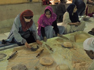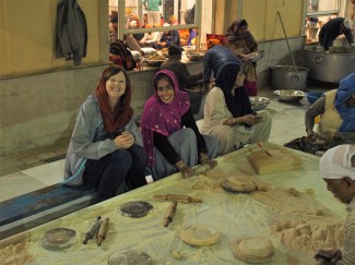 We went to the kitchen, wow, it was amazing. Cross legged ladies and one seated white bearded gentleman rolled out tiny rounds of dough into chapatis. “You make?” the young pretty lady wearing a bright purple scarf asked. I sat next to her and she placed a piece of dough in front of me and handed me a small wooden rolling pin. She added my rough attempts to her perfectly formed piles.