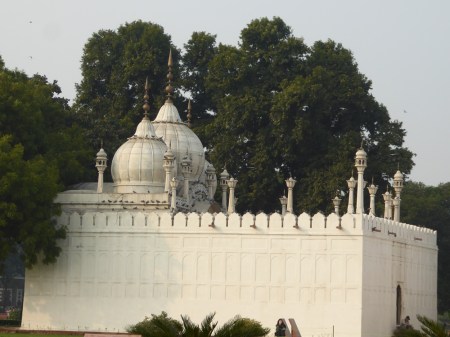 One of the buildings that we wished to see in the Red Fort was the Moti Mosjid, otherwise known as the Pearl Mosque. All those years ago the Emperor had just a few steps to take from his palace to his private mosque. Unfortunately, it is surrounded by a high wall and entrance to the mosque at the time of our visit was not permitted.