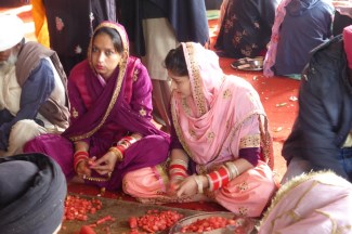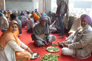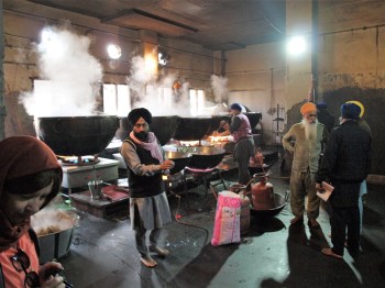 Huge metal pans stood on gigantic gas burners, their contents bubbling away. Volunteer cooks periodically stirred them with giant sized utensils. Sacks of basmati rice stood nearby.