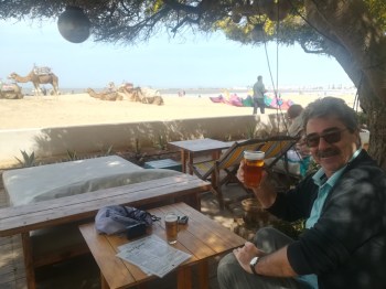 Well, we did say that our final destination of our time in Morocco would be a more relaxing time as there isn’t the list of architecture to see. So, we are now sat in a beachfront bar on bright yellow and cream striped deckchairs watching the world go by. And we have beers!
