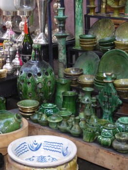 One or two of the traders in the souks had fixed prices but the majority relied on their bargaining skills. From a fixed price stall we had already purchased a ceramic cruet set that was designed like miniature tagines complete with conical shaped lids. The price we paid was just 25 MAD.