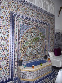 Stopping for a rather late lunch on the top terrace of an eatery close to the Bab Boujloud (Blue Gate), we had a wonderful view of the gate itself and also of a couple of minarets. It is quite difficult to see the impressively decorated minarets as the alleys of the medina are so narrow.