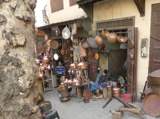 We stopped for mint tea in a busy and noisy square. Place el-Seffarine has been the home of copper, brass and silverware makers for hundreds of years.