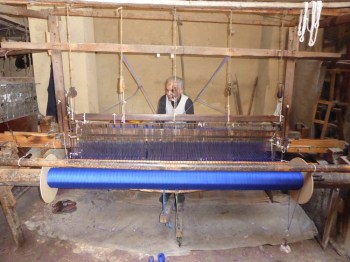 A man was sat at a wooden loom. He was pushing the two wooden treadles in turn with his feet and pulling down the wooden mechanism simultaneously, turning the royal blue thread into reams of material.