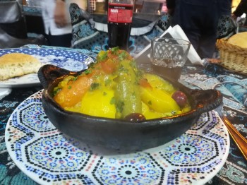 Dave ordered harira soup to begin with followed by a chicken and vegetable tagine and I chose a beef and vegetable tagine. Both were delicious and they were brought to the table steaming. The vegetables included carrots, peas, turnips, potatoes and courgettes.