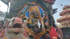 A colourful shrine of Kala (or Kaal) Bhairab drew many devotees, including a young couple soon to be married paying their respects.