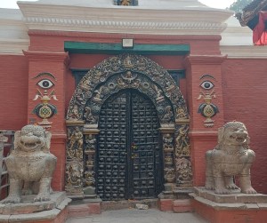 The richly embellished portal guarded by two white stone lions is the entrance to the Taleju Temple.
