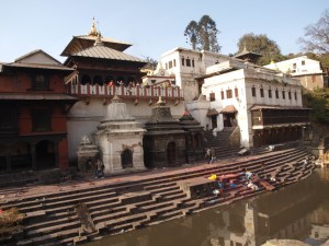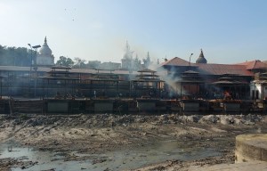 The pyres for the deceased can be seen across the sacred Bagmati River. This river flows into the Ganges.