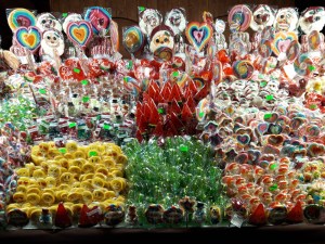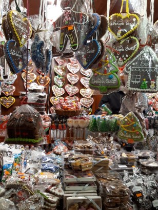 This time we noticed the stall with hundreds of differently patterned rolling pins. A printer was selling a huge assortment of ink stamps with various pictures, words and slogans. One stall had Christmas table centrepieces; different shaped brightly coloured lollies and sweets filled two others.