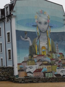 The four of us slipped and slided down St. Andrew’s Descent, which is the cobbled steep road linking old Kiev with Podil. Noticing an interesting piece of street art, I took a photo and then hurriedly put my gloves on again. It was cold!