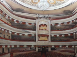 It has a huge 3D painting of a theatre on one of its walls. The painting apparently covers Lenin bas reliefs.