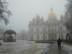 The weather was freezing, and the ground was extremely icy and slippery. Low cloud and fog enveloped the domes of some of the churches.