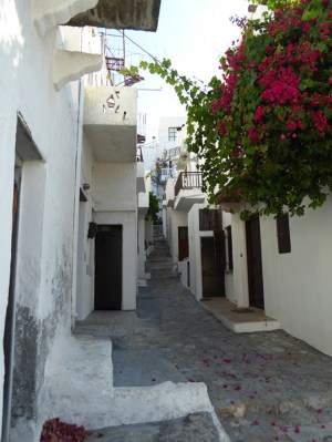 We headed up the hill into the Chora hoping to find a pension, B+B place or just a simple room to rent. According to the internet both rooms, and apartments were available for rent in the Chora but we could not find them. We stopped three or four people who all told us the same story, ‘there are no rooms up in the Chora.’ So we headed back down the hill again.