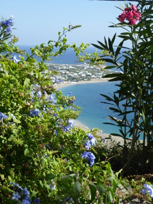We spotted the rock with the chapel and also a windmill in the distance on the coast and decided to walk to them. We headed down to sea level and the small resorts of Molos and Magazia. There were a few pensions and signs advertising rooms for rent, but no big hotels or mass tourism.